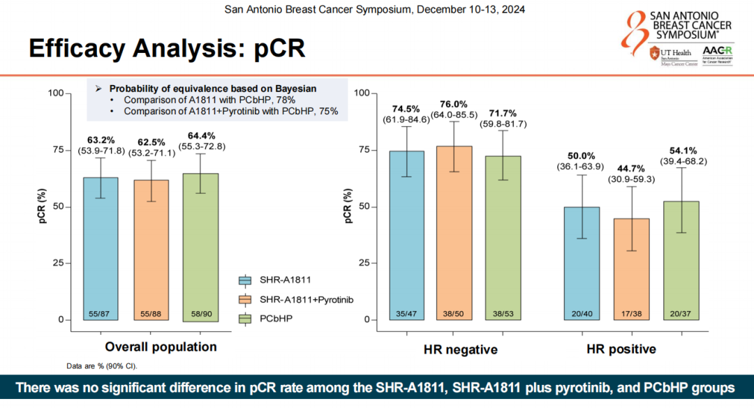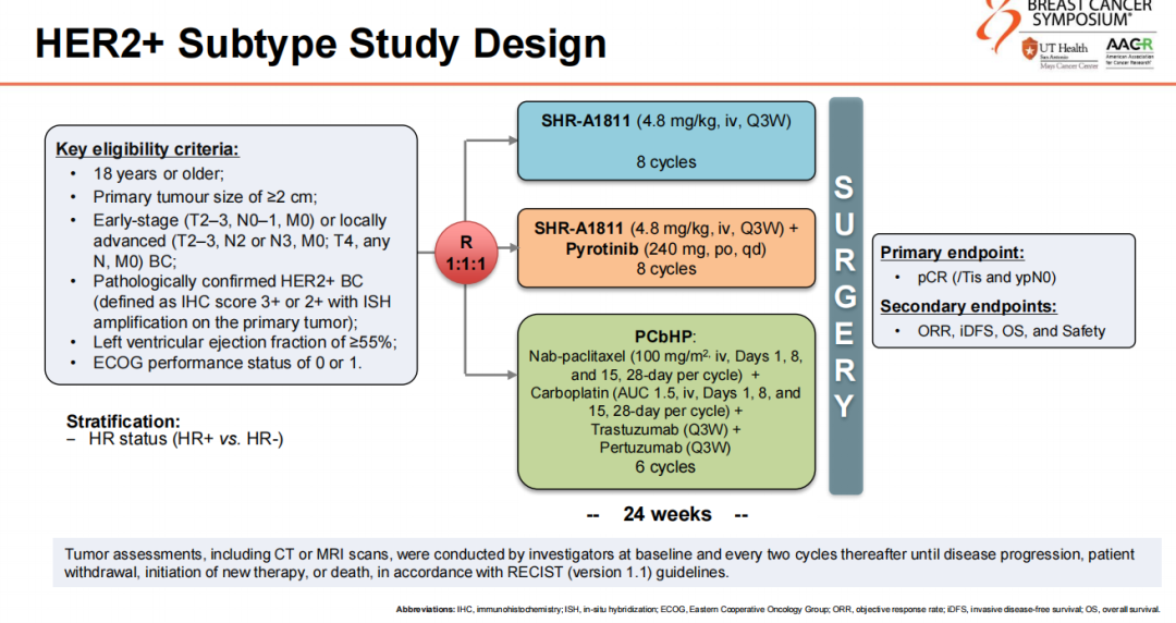 另外,李俊杰教授代表邵志敏教授团队报道了FASCINATE-N研究的数据。该研究基于精准平台进行乳腺癌分型,并设计了针对不同类型乳腺癌的新辅助治疗方案。SHR-A1811的研究设置了三个治疗组:A组为SHR-A1811单药治疗组,B组为SHR-A1811联合吡咯替尼治疗组,C组为PCbHP方案治疗组。总体来看,该研究入组的患者肿瘤负荷还是比较大的,肿瘤大于5cm的患者比例比较高,同时有90%的病人淋巴结状态为阳性。但结果显示,SHR-A1811单药组的pCR率达到了63%,非常令人鼓舞。然而,想要更好地筛选新辅助治疗阶段对抗HER2治疗有效的病人,仍需要更多围绕生物标志物的研究来进行进一步探索。
