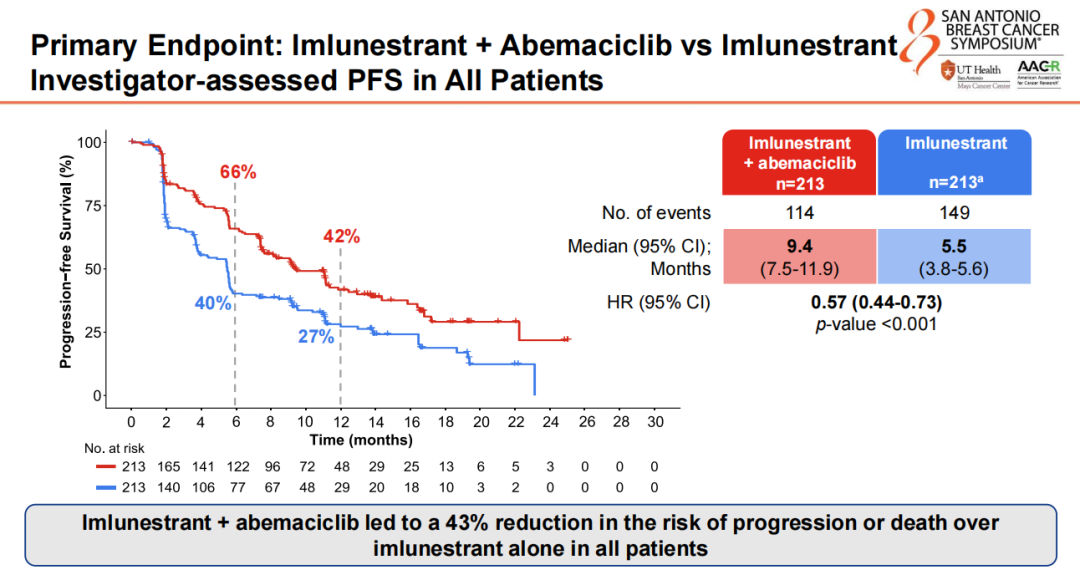 本次大会公布的EMBER-3研究(摘要号:GS1-01)就是该领域的探索之一。该研究探讨了SERD(Imlunestrant)作为单药治疗以及与阿贝西利联合治疗在ER阳性、HER2阴性晚期乳腺癌患者中的疗效和安全性。结果显示,Imlunestrant单药治疗在ESR1突变患者中(较SOC)显著改善了无进展生存期;Imlunestrant联合阿贝西利相较于Imlunestrant单药组显著提高了PFS。这一结果非常令人兴奋,为这类乳腺癌的治疗提供了很好的依据。