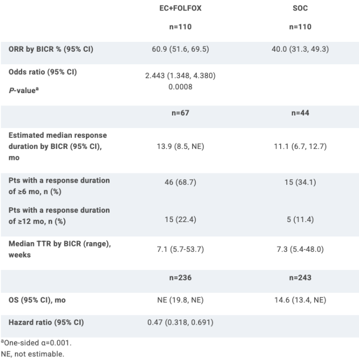 共有479例患者被随机分配到EC+FOLFOX和SOC两组(EC+FOLFOX组:236例;SOC组:243例)。各组的人口统计学和疾病基线特征相似,中位年龄为61岁,男性占比50.5%,ECOG PS评分为0的患者占比54.3%。在数据截止时(2023年12月22日),EC+FOLFOX组与SOC组相比,经确认的ORR具有临床和统计学意义上的显著改善。两组的ORR分别为60.9%vs 40.0%,优势比(OR)=2.443,单侧P值=0.0008,达到双主要终点。观察到EC+FOLFOX组疗效迅速且持久。