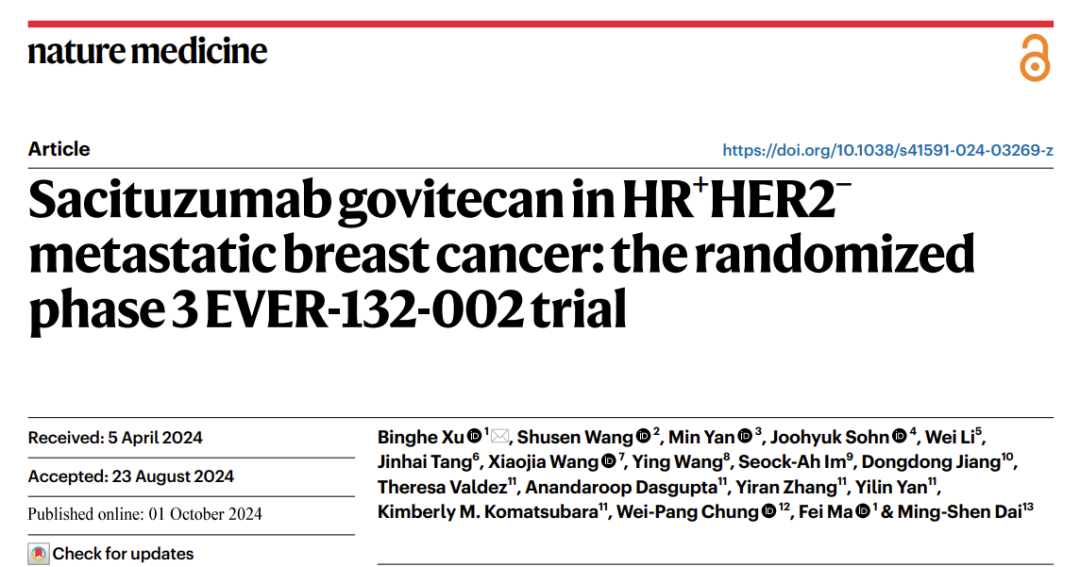 研究题目:Sacituzumab govitecan in HR+HER2-metastatic breast cancer:the randomized phase 3 EVER-132-002 trial