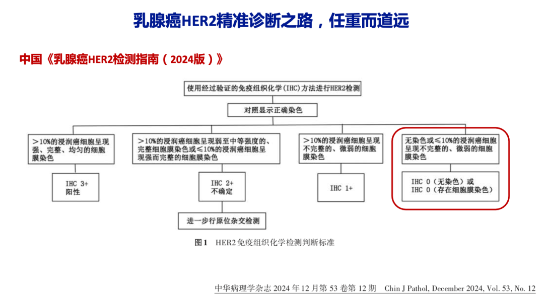 以往,HER2超低表达患者通常被归类为HER2零表达。然而,无论是我国的《CSCO BC指南》还是美国的《NCCN指南》,现在都对HER2零表达患者进行了进一步细分,包括完全没有膜染色的HER2无表达患者,以及≤10%的癌细胞呈现较弱不完整染色的HER2超低表达患者。这是目前在检测方面的主要变化。