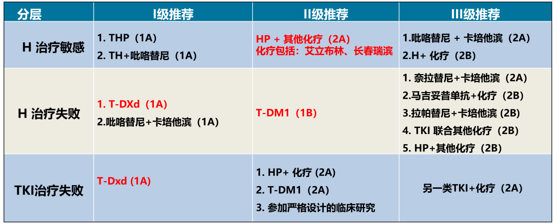 对于H治疗失败患者:德曲妥珠单抗(T-DXd)继续保持Ⅰ级推荐优选方案(1A);将恩美曲妥珠单抗(T-DM1)证据级别由1A调整降低为1B;