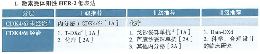 2.对于激素受体阳性(HR+)且HER2低表达(HER2-low)晚期乳腺癌(图2):T-DXd等级提升为Ⅰ级推荐优选方案(1A)。