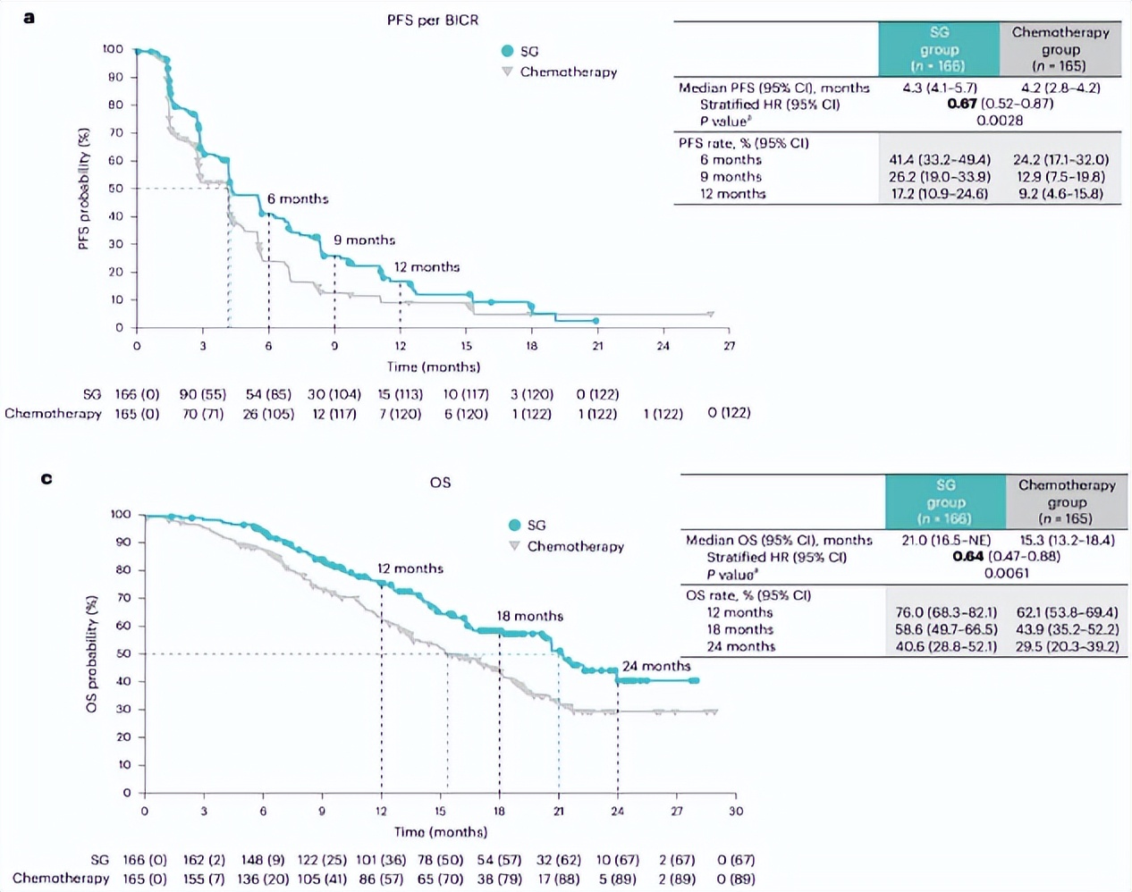 在此基础上,针对亚裔人群的EVER-132-002研究正式开展,其中70%的患者来自中国大陆,并取得了与国际TROPiCS-02研究类似的结果,改善了mPFS,6个月、9个月和12个月PFS率均显著提升近2倍;mOS(21.0个月vs 15.3个月;HR 0.64;95%CI:0.47-0.88;P=0.0061)也得到了延长(图2)[4]