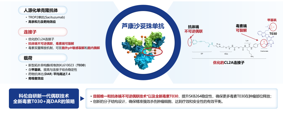 芦康沙妥珠单抗具有创新的药物结构分子设计,由靶向TROP2的人源化单克隆抗体hRS7通过优化的可裂解的CL2A连接子与我国自研的拓扑异构酶Ⅰ抑制剂T030连接组成,药物抗体比(DAR)为7.4,几乎实现满载。在技术层面,芦康沙妥珠单抗的连接头是甲磺酰基嘧啶,采用当前唯一的抗体端不可逆偶联技术,使抗体与连接子不会发生解耦分离;细胞毒载荷T030含甲基砜,与连接子结合的稳定性更高。因此,芦康沙妥珠单抗在血浆中的稳定性得到提升,并能更多地聚集在肿瘤局部组织,再通过胞外pH敏感裂解及胞内酶释放细胞毒载荷T030,发挥抗肿瘤作用,实现了疗效与安全性的平衡。