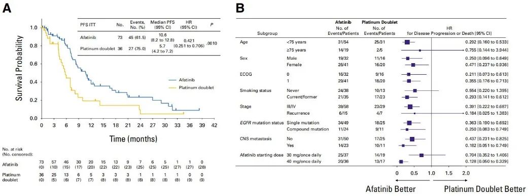 全组患者的中位随访时间为12.5个月,阿法替尼组和含铂双药化疗组的中位PFS分别为10.6个月和5.7个月,HR=0.42,P=0.001,不同亚组的患者均可以从这一治疗中获益。40mg和30mg起始剂量组的患者,HR值分别为0.128和0.704。