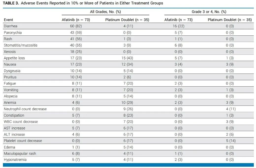 全因任何级别不良反应发生率分别为97%和94%,其中,3度以上不良反应发生率分别为44%和37%。阿法替尼组最常见的不良反应包括腹泻82%,皮疹56%,口腔黏膜炎55%;而化疗组最常见的不良反应为食欲下降43%和恶心34%。因为不良反应而导致治疗终止的患者占比分别为16%和5.7%,阿法替尼组因不良反应导致剂量降低的患者比例为53%,最终接受阿法替尼40mg、30mg、20mg以及20mg,隔日一次治疗的患者比例,分别为23%、41%、27%和8%。