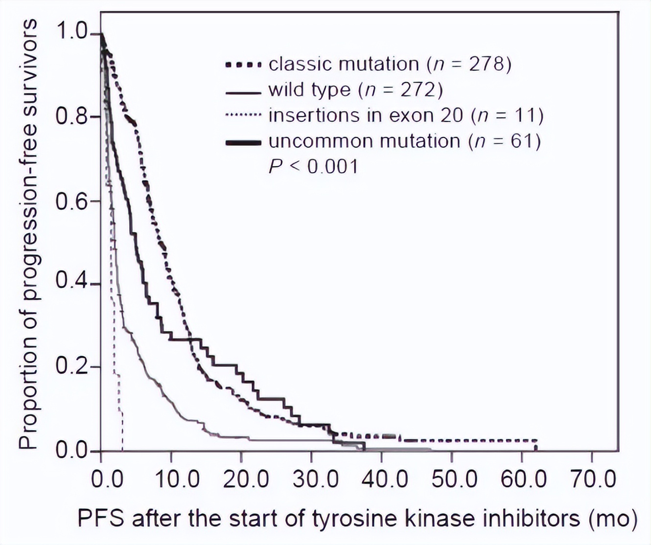 经典突变、非经典突变、插入突变及野生型患者的PFS