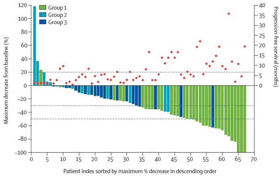 二代药物是目前临床应用最为广泛的选择,而其依据的临床研究数据为LUX-Lung 2/3/6的荟萃分析。该研究共纳入75例患者,并根据突变类型分为三组:第1组为点突变组,第2组为以T790M突变为基础的单个或复合突变组,第3组为携带原发性20外显子插入突变。数据分析发现,第2组和第3组的ORR分别为14.3%和8.7%,中位PFS分别为2.9个月和2.7个月,中位OS分别为14.9个月和9.2个月;而第1组患者则展示了较好的疗效,ORR、DCR、中位PFS和中位OS分别为71.1%、84.2%、10.7个月和19.4个月8。