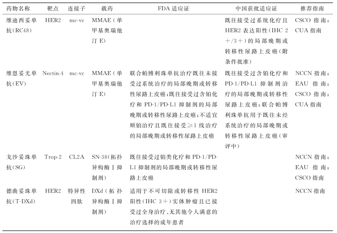晚期尿路上皮癌严重影响患者生存。长期以来,以顺铂为基础的化疗方案作为晚期转移性尿路上皮癌的一线标准治疗方案,患者中位生存期仅8~14个月。随着免疫时代的到来,多个程序性死亡-受体1(PD-1)/程序性死亡-配体1(PD-L1)抑制剂被美国FDA和我国NMPA批准用于治疗晚期尿路上皮癌,另外,成纤维生长因子受体(FGFR)抑制剂与抗体偶联(ADC)药物的研究取得突破,并先后被批准用于临床,国内外已经有多个ADC药物被用于尿路上皮癌的治疗,包括维迪西妥单抗(Disitamab Vedotin,RC48/DV)、维恩妥尤单抗(Enfortumab Vedotin,EV)、戈沙妥珠单抗(Sacituzumab Govitecan,SG)以及德曲妥珠单抗(Trastuzumab DeruxtecanT-DXd)。