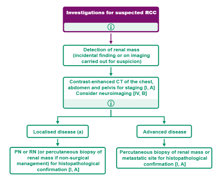 1、疑似肾癌患者应接受横断面影像学检查、组织病理学分析和实验室检查等相关检查[I,A]。