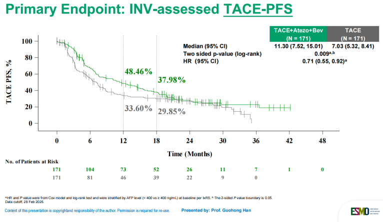 编者按:2025年7月3日,在2025年欧洲肿瘤内科学会胃肠道癌症大会(ESMO GI 2025)上,III期临床研究TALENTACE作为突破性进展(Late-Breaking Abstract,LBA2) 公布关键结果,受到全球肿瘤学界高度关注。该研究评估了阿替利珠单抗+贝伐珠单抗(简称:T+A)联合按需经动脉化疗栓塞术(TACE)在未接受过全身系统治疗的不可切除肝细胞癌患者中的疗效和安全性。研究结果显示,主要终点TACE无进展生存期(TACE-PFS)取得了统计学和临床意义上的显著改善,中期分析时总生存期(OS)尚不成熟。同时,由RECIST v1.1标准评估的无进展生存期(PFS)也观察到了有临床意义的改善。这一突破性研究为肝癌治疗领域带来了新的希望,标志着局部肿瘤控制与系统分子干预的联合治疗模式取得重大进展。