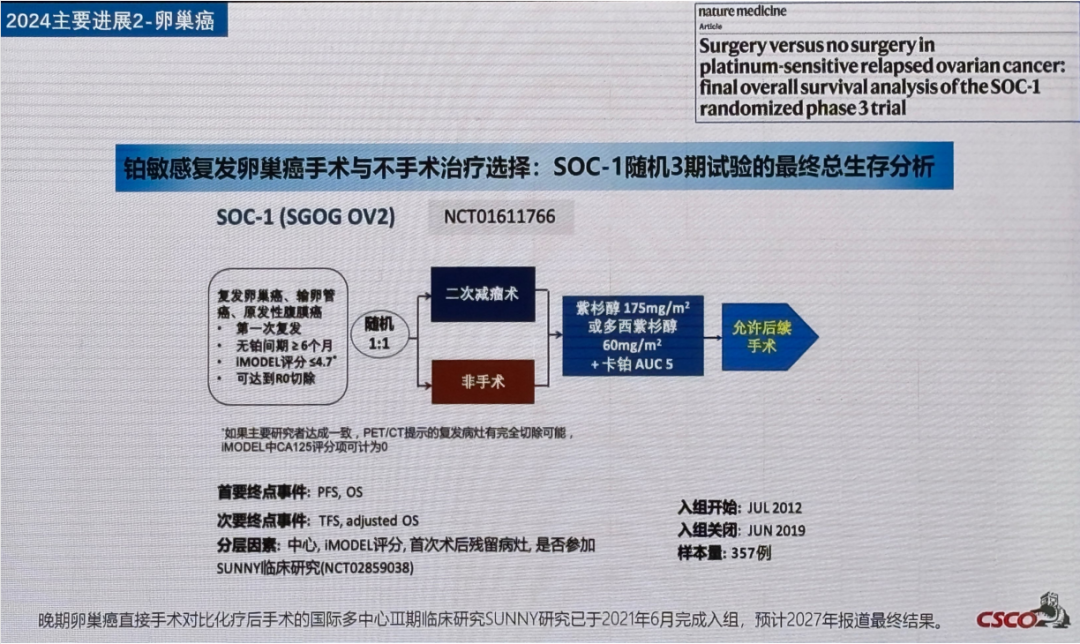 2.Rong,Jiang,Yanling,Feng,Yulian,Chen et al.Surgery versus no surgery in platinum-sensitive relapsed ovarian cancer:final overall survival analysis of the SOC-1 randomized phase 3 trial.[J].Nat Med,2024,30:0.