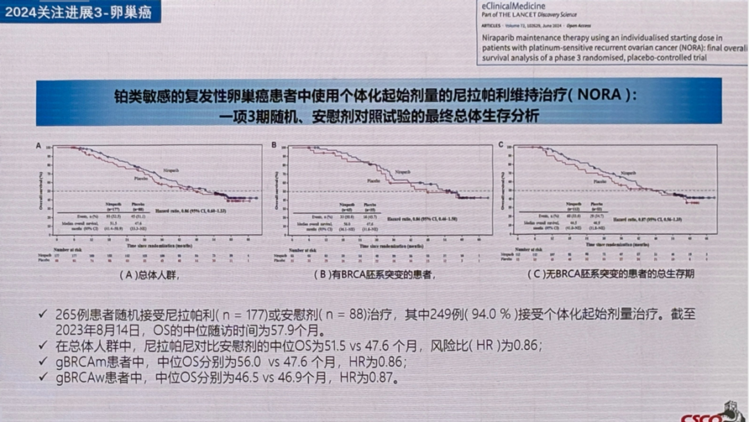 复旦大学附属肿瘤医院吴小华教授团队主持开展的III期NORA研究是在中国进行的一项探讨了尼拉帕利个体化起始剂量在铂类敏感复发性卵巢癌(PSROC)患者中的疗效和安全性。结果显示,中位随访时间为57.9个月,在意向治疗(ITT)人群中,尼拉帕利组中位PFS为18.3个月,显著优于安慰剂组的5.4个月(HR 0.32;95%CI 0.23-0.45;P<0.0001);中位OS分别为51.5个月和47.6个月(HR 0.86)。无论BRCA突变状态如何,均观察到相似的PFS获益及OS获益趋势。该个体化策略有望成为PSROC标准治疗新选择。