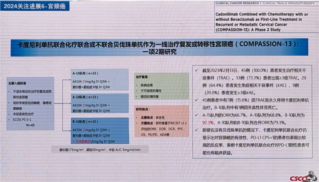 11.Hanmei,Lou,Hongbing,Cai,Xin,Huang et al.Cadonilimab Combined with Chemotherapy with or without Bevacizumab as First-Line Treatment in Recurrent or Metastatic Cervical Cancer(COMPASSION-13):A Phase 2 Study.[J].Clin Cancer Res,2024,30:0.