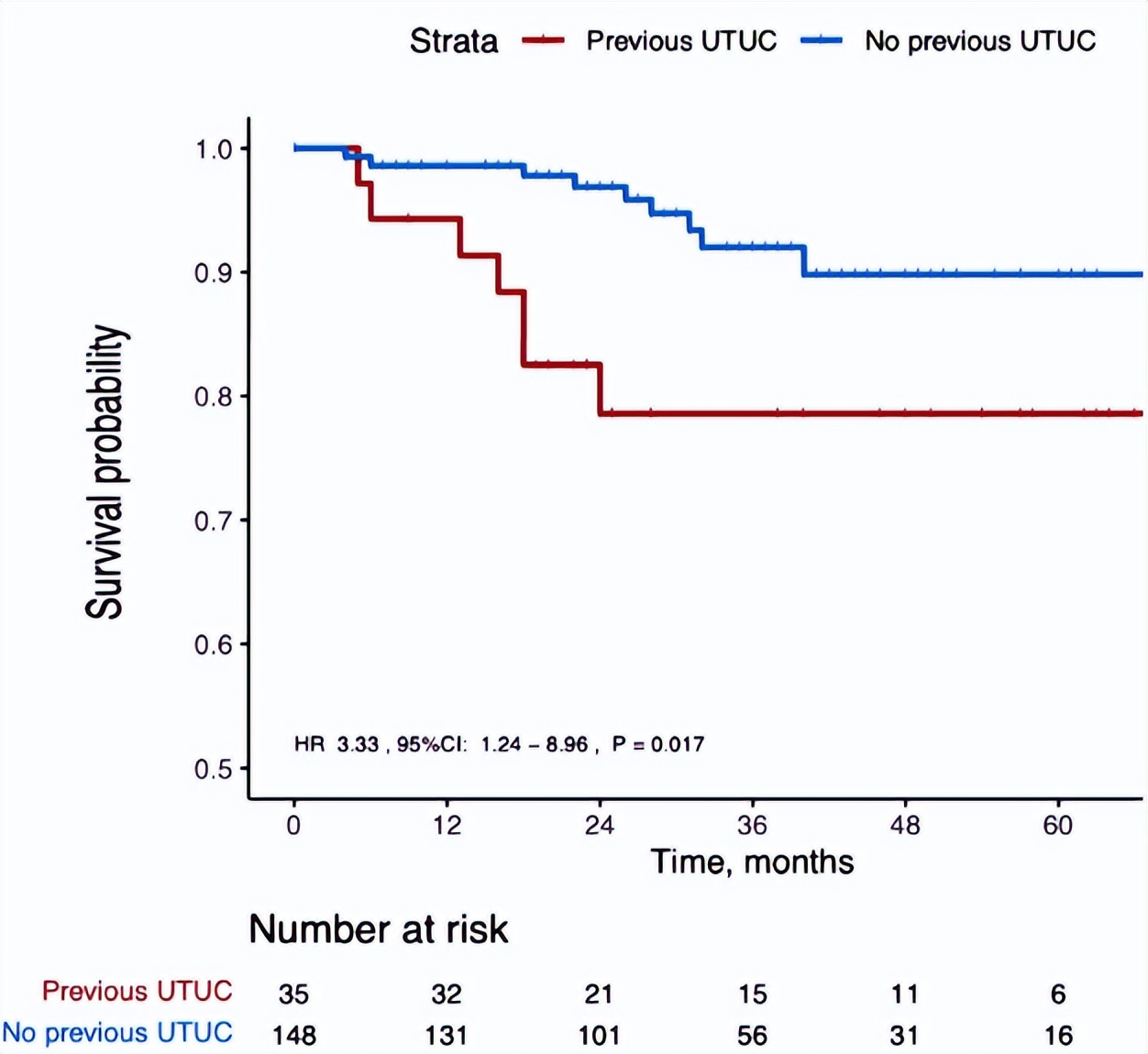 在非匹配分析中,异时性NMIBC与膀胱内高危复发风险增加相关,多变量分析显示,异时性NMIBC亚组复发率为54.3%,而原发NMIBC亚组复发率为28.4%(P=0.012,HR 3.12)。组间复发平均时间相似(异时性NMIBC亚组为11.2个月,原发NMIBC亚组为13.2个月,P=0.548)。除了既往UTUC病史外,多变量分析显示,其他复发高危因素包括EAU风险评分高(P=0.047,HR 2.84)和未能继续维持BCG治疗长达6个月(P=0.009,HR 5.49)。此外,异时性NMIBC亚组中有10例患者(28.6%)最终进展为MIBC,显著高于原发NMIBC亚组,后者仅有7例患者(4.7%)出现疾病进展(P=0.007,HR 4.19)。异时性NMIBC亚组也显示出更高的远处转移进展率(20%vs.6.5%,P=0.017,HR 3.33)。在非倾向匹配分析中,总生存率无显著差异(8.6%vs.18.4%,P=0.248,HR 0.44)。