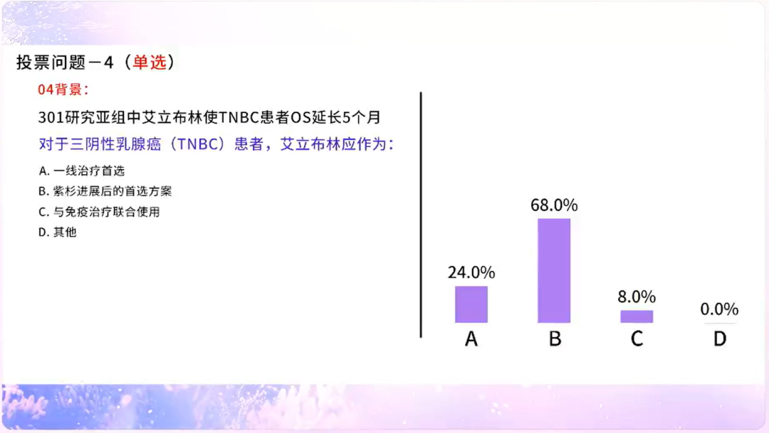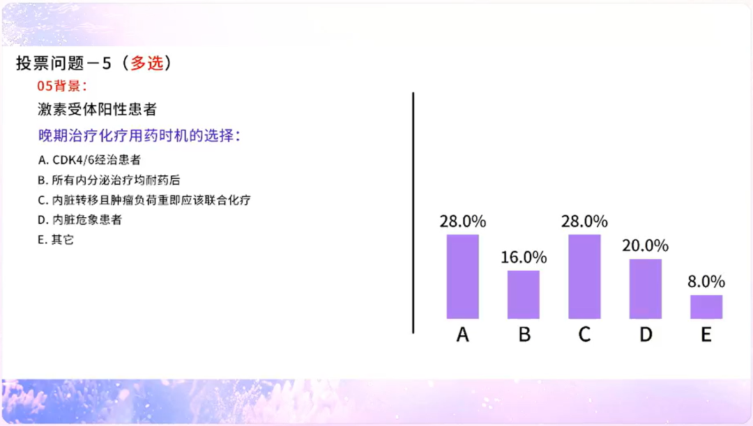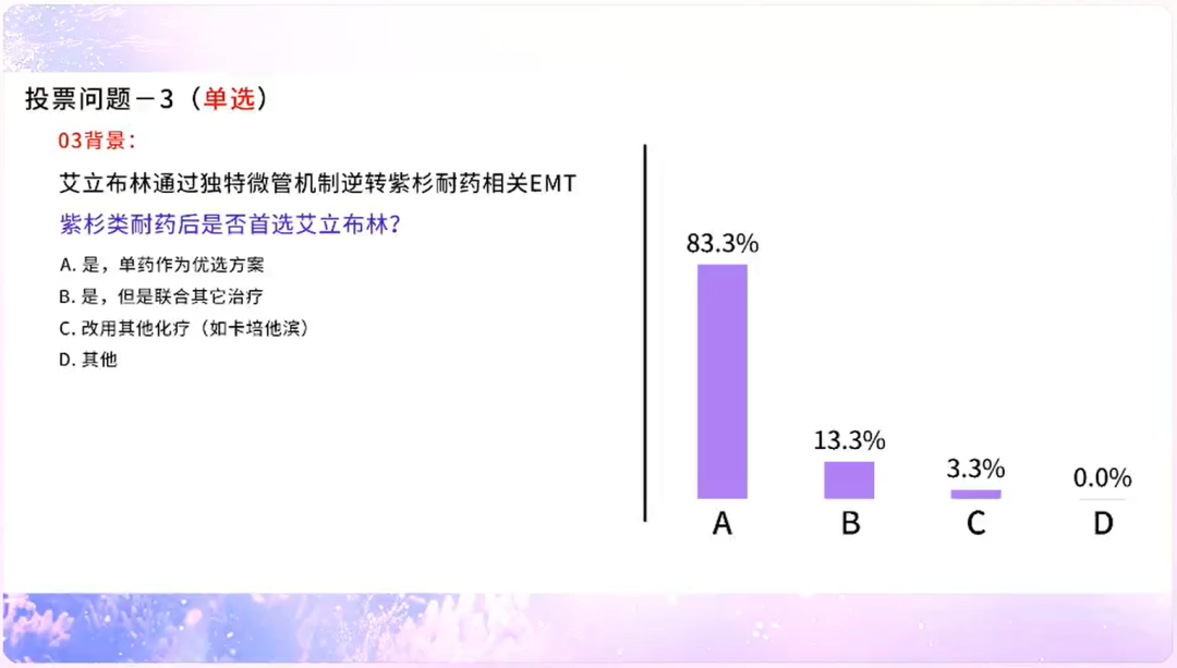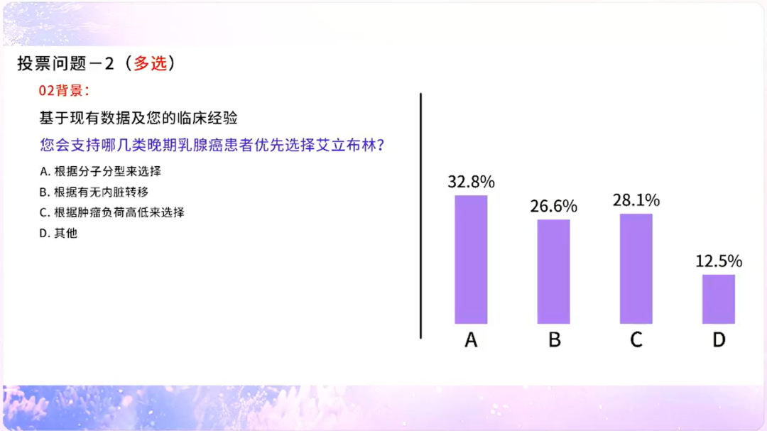 基于EMERALD研究,高达84.4%的专家支持将艾立布林替代紫杉用于HER2+晚期乳腺癌一线治疗;在临床实践中,专家会基于分子分型(32.8%)、有无内脏转移(26.6%)、肿瘤负荷(28.1%)等因素来选择艾立布林,肯定了艾立布林具有高效、快速控制肿瘤的作用;再者,基于当前循证医学证据,有高达83.3%的专家将艾立布林作为紫杉耐药患者的优选方案;尤其在TNBC患者中,近七成(68%)专家支持将艾立布林作为紫杉进展后的首选方案;针对HR+乳腺癌患者的晚期化疗时机,除了内脏危象(20%)和内脏转移且肿瘤负荷高(28%)等需要快速解救治疗的患者以外,也有相当比例(28%)的专家支持化疗是CDK4/6i经治后的重要选择。