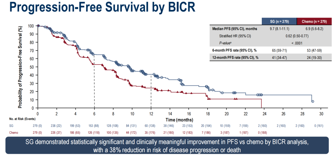 研究结果显示达到了主要终点,BICR评估SG组的中位PFS相较于化疗组延长2.8个月,疾病进展或死亡风险显著降低38%(9.7 vs 6.9个月,HR 0.62,95%CI:0.50-0.77,P<0.0001);研究者评估的PFS获益表现一致(9.6 vs 6.8个月,HR 0.64,95%CI:0.52-0.79)。此外,在各个亚组均呈现一致的获益趋势。