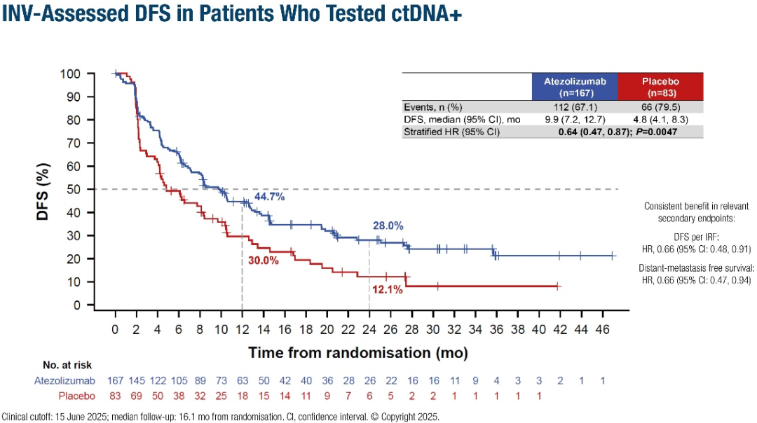 根据2025年ESMO大会上公布的结果,在中位随访16.1个月的随访中,阿替利珠单抗组患者的研究者评估的中位无病生存期(DFS;主要终点)为9.9个月,而安慰剂组为4.8个月(HR 0.64;95%CI 0.47-0.87;P=0.0047),中位总生存期(OS)为32.8个月,而安慰剂组为21.1个月(HR 0.59;95%CI 0.39-0.90;P=0.0131)。