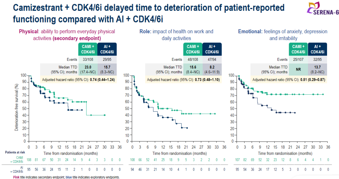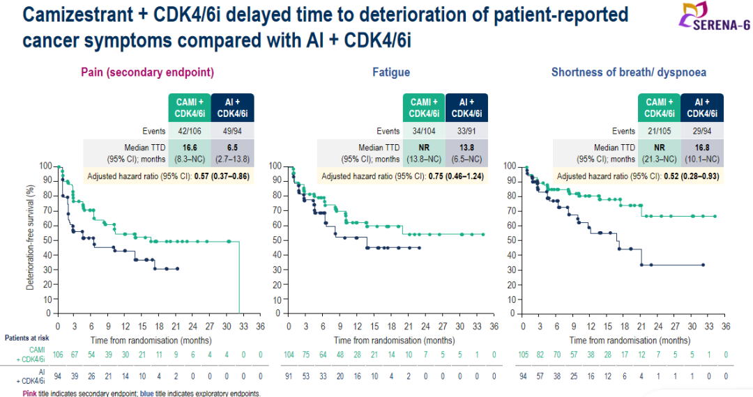 结果显示,Camizestrant组(n=157)和AI组(n=158)间的EORTC QLQ-C30及EORTC QLQ-BR23基线评分相似。与AI组相比,切换至Camizestrant组治疗的患者延迟了疼痛(HR 0.57;95%CI:0.37-0.86)、疲劳(HR 0.75;95%CI:0.46-1.24)、气短/呼吸困难(HR 0.52;95%CI:0.28-0.93)等至疾病恶化时间(TTD)。