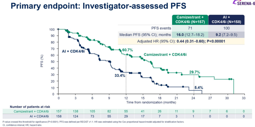 • 12个月PFS率:Camizestrant组60.7%vs AI组33.4%