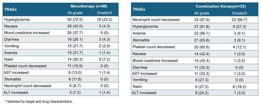 截至2025年5月30日,69例患者被纳入单药治疗研究。其中44例(63.8%)患者存在PIK3CA突变;41例(59.4%)患者既往接受过≥2线治疗。截至2025年8月19日,联合治疗研究入组33例患者,其中30例(90.9%)患者存在PIK3CA突变;22例(66.7%)患者除辅助内分泌治疗外,既往未接受过任何系统性抗肿瘤治疗。此外,两项研究中,均有近50%的患者合并糖尿病或糖尿病前期。