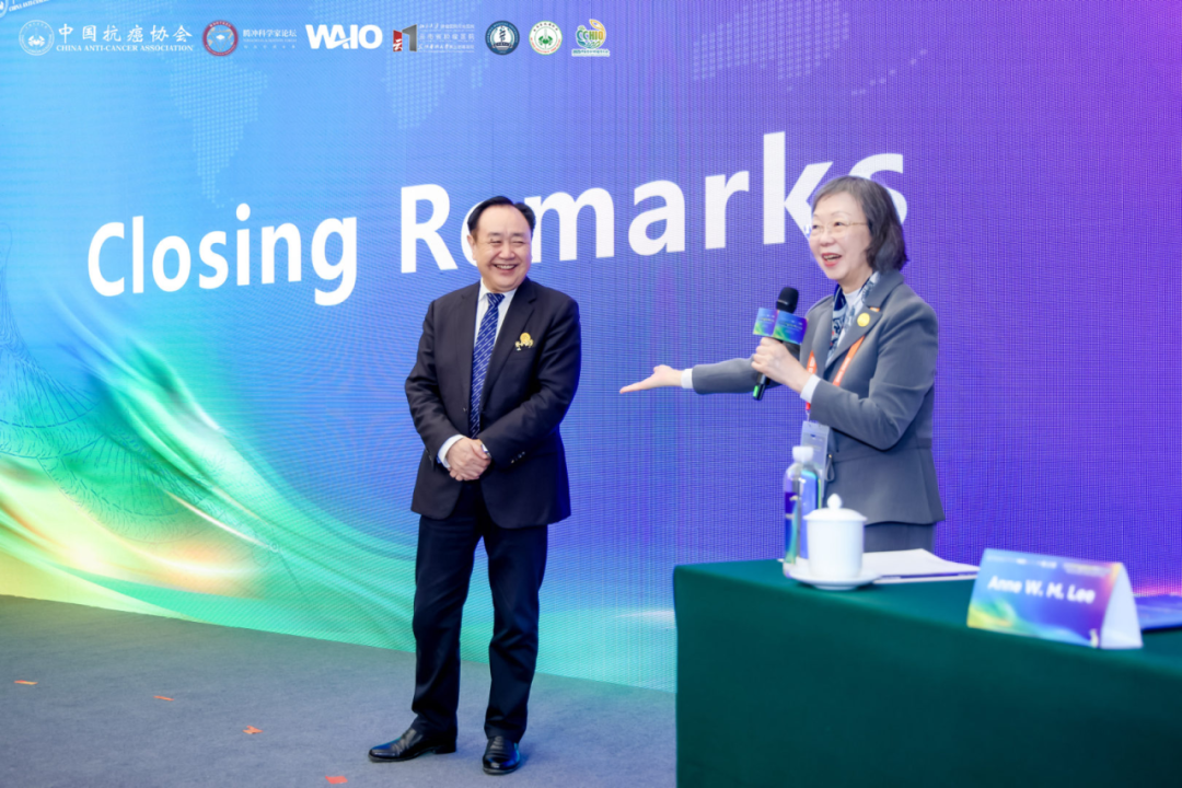会议闭幕环节由樊代明教授与Anne W.M.Lee教授共同主持。樊代明教授对本次专场成果给予高度评价,认为其在内容深度与广度上均超越往届,为与会者提供了丰富的学术启示与实践参考。他代表中国抗癌协会及CCHIO组委会向所有讲者、主席与听众致以感谢,并期待未来继续深化此类国际对话。Anne W.M.Lee教授在总结发言中对中外专家的精彩报告与深入交流表示赞赏,她特别强调了CACA与UICC持续合作对推动全球癌症防治整合发展的重要意义,并期待双方未来能进一步深化务实合作,共同为肿瘤患者带来更多获益。
