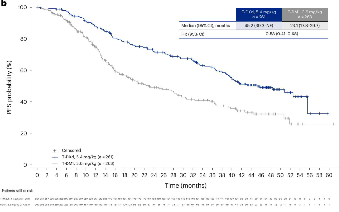 DESTINY-Breast03长期随访结果显示,T-DXd显著延长生存获益,mOS达到52.6个月,意味着约一半的患者生存接近甚至超过5年,将使患者有更大机会等到更先进的治疗手段,从而为患者带来了治愈的希望[8]