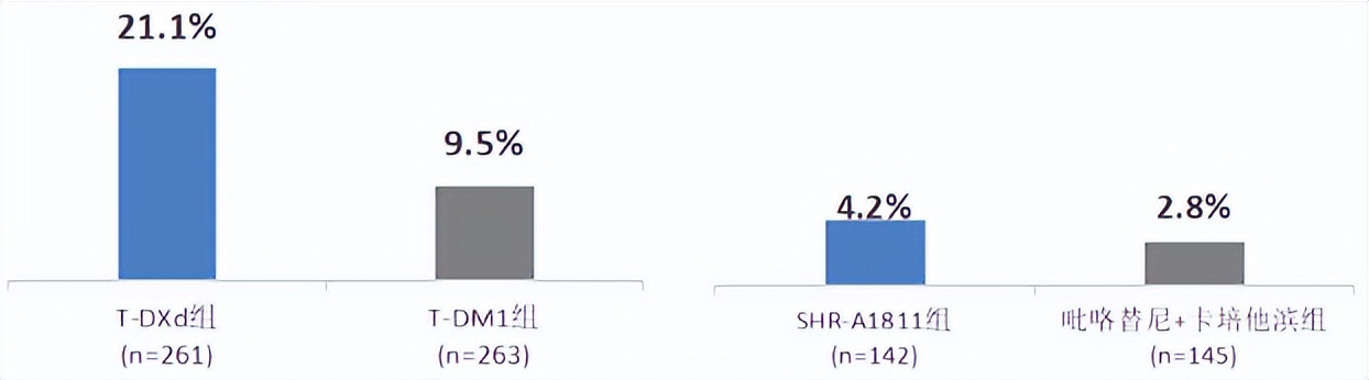 在HER2阳性乳腺癌二线治疗的ADC中,DESTINY-Breast03研究的T-DXd取得了当前最大的CR值,为21.1%,中位缓解持续时间(DoR)为36.6个月,意味着部分患者可能长时间维持完全缓解的无病状态,为患者争取了治愈的希望。而在HORIZON-Breast01研究中,SHR-A1811的CR率仅4.2%,mDoR为27.8个月,患者缓解深度不尽人意,可能对未来mOS数据产生不利影响。