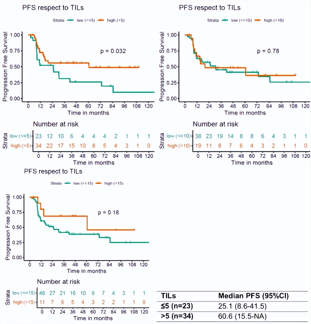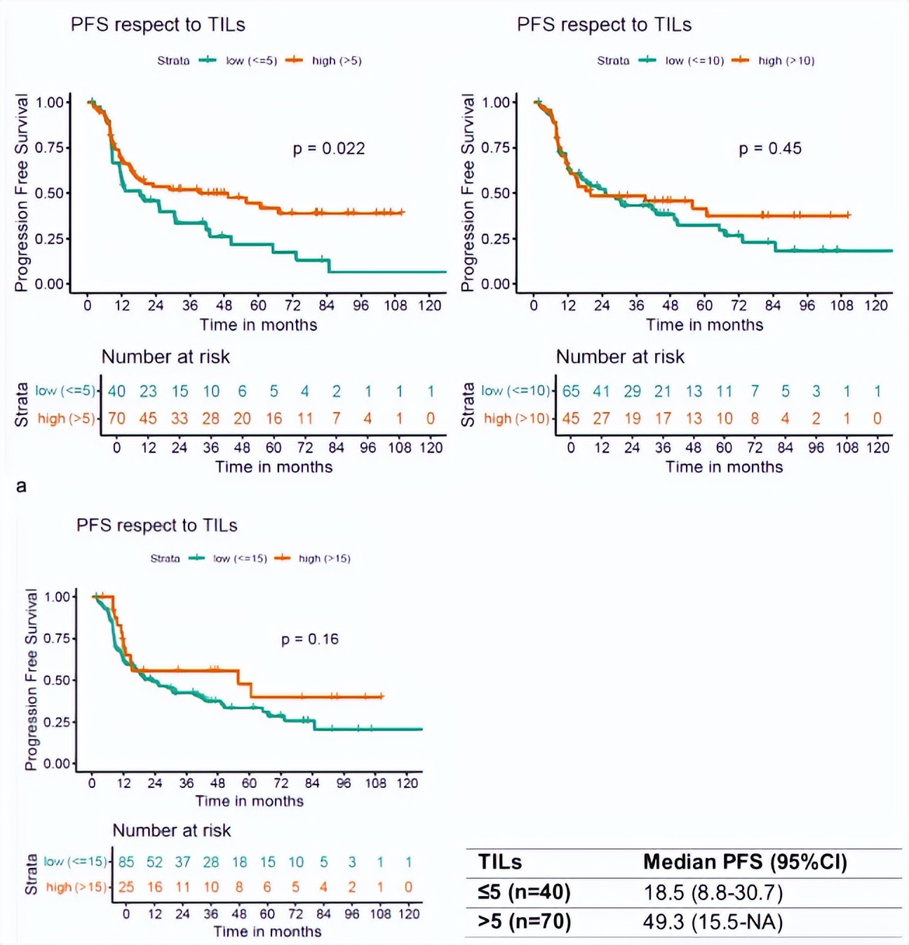 关于生存结局,研究者评估了TILs水平与PFS之间的相关性。由于目前尚无关于TILs高/低评分截断值的共识,研究者使用TILs分布的第25、50和75百分位数(分别为5%、10%和15%)来探讨TILs在mBC中的预后作用。确定的第25百分位数(TILs值为5%)作为区分预后的潜在截断值。高TILs组的PFS显著长于低TILs组(中位数:49.3个月vs.18.5个月;P=0.022)。值得注意的是,高TIL(截止值>5%)在HR-患者中更为常见(74%HR-vs.55%HR+,P=0.048)。