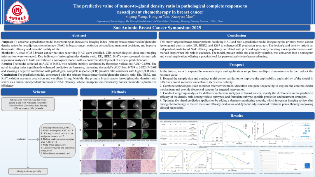 2025年第48届圣安东尼奥乳腺癌研讨会(San Antonio Breast Cancer Symposium,SABCS)于12月9日-12日在美国圣安东尼奥召开。中国医科大学附属第一医院毛晓韵教授领衔(主要研究者:汪时劲、魏宏芮)的一项回顾性研究在本会议上进行了壁报展示(摘要编号:P4-05-18),该研究开发并验证了一种基于术前乳腺钼靶影像特征和临床病理指标的列线图模型,用于预测乳腺癌患者新辅助化疗(Neoadjuvant chemotherapy,NAC)后的病理完全缓解(Pathological complete response,pCR)概率。该模型展现出优异的预测性能和校准能力,决策曲线分析表明其在较宽的阈值概率范围内具有显著的临床净获益。这一研究成果为乳腺癌患者NAC疗效的术前精准预测提供了有力工具,有助于指导个体化治疗决策。肿瘤瞭望特邀毛晓韵教授进行介绍,并邀请陆军军医大学大坪医院徐琰教授对该研究进行点评。