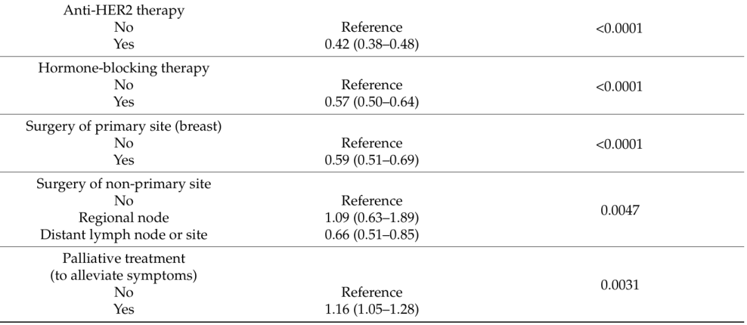 接受激素阻断治疗女性的OS率(HR 0.56)高于未接受激素阻断治疗的女性。接受原发性肿瘤(乳腺)手术女性(HR 0.33)的OS率高于未接受手术的女性。值得注意的是,远处淋巴结或转移部位手术也提高了OS率(HR 0.64),而区域淋巴结手术的OS率(HR 0.65)与未进行手术相比相似。接受原发部位(乳腺)放射治疗(HR 0.54)、局部淋巴结放射治疗(HR 0.29)和远处淋巴结或部位放射治疗(HR 0.83)患者的OS率高于未进行任何部位放射治疗的患者。然而,与未进行姑息治疗相比,接受姑息治疗以缓解症状的患者OS率较低(HR 1.29)。