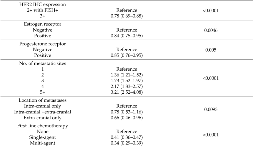 在多变量Cox比例风险分析中,年龄、Charlson–Deyo合并症评分、组织学、HER2 IHC表达、ER表达、PR表达、转移部位数量、转移部位(仅颅内/颅内和颅外/仅颅外)以及接受一线化疗、抗HER2治疗、激素阻断治疗、原发部位(乳腺)手术、非原发部位手术和姑息治疗是影响OS的独立因素。种族和放射在多变量分析中并不显著。