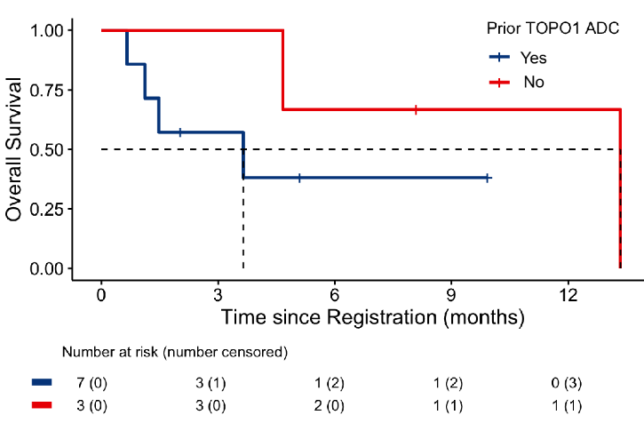 ≥2级的治疗相关不良事件(TRAE)发生率为70%(n=7/10),最常见为口腔炎(40%,n=4)、疲劳(30%,n=3)和恶心(30%,n=3);仅观察到1例4级TRAE(呼吸困难)。无患者发生间质性肺疾病(ILD)或5级TRAE。根据NANO评分,7例基线时有CNS症状的患者中,5例至少有一种症状得到改善,1例患者症状稳定,1例患者缺失随访NANO评估。