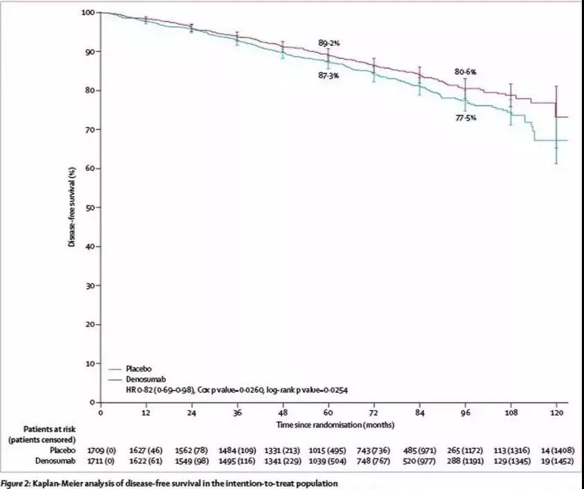 中位随访73个月结果:地诺单抗组和安慰剂组比较如下:①总DFS:地诺单抗组无病生存率显著提高(HR 0.82,95%CI 0.69-0.98,多因素比例风险回归模型分析, p=0.0260;描述性统计学分析,未控制多重性)。②5年和8年DFS:地诺单抗组5年无病生存率为89.2%(95%CI 87.6-90.8%),8年随访为80.6%(78.1-83.1%),而安慰剂组5年无病生存率为87.3%(85.7-89.0%),安慰剂组8年无病生存率为77.5%(74.8-80.2%)。③不良事件发生情况:地诺单抗组(1367例[包括521例严重]不良事件)和安慰剂组(1339例[515例严重])的不良事件总数相似。骨关节炎:地诺单抗组62例(3.6%)vs.安慰剂组58例(3.4%)。半月板损伤: 23例(1.3%)vs. 24例(1.4%)。白内障:16例(0.9%)vs. 28例(1.7%)。地诺单抗组有1例(<0.1%)治疗相关死亡(肺炎、败血症性肾衰竭和心脏失代偿所致)。