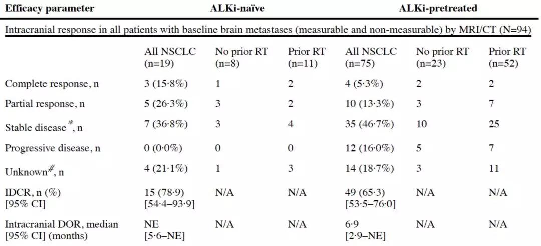 I期ASCEND-1临床研究中,回顾分析入组患者中94例(38.2%)脑转移患者,发现二代ALK抑制剂塞瑞替尼起效时间为6.1周,同全组246例患者起效时间一致,对曾接受克唑替尼耐药的患者有效,疾病控制率为65.3%。