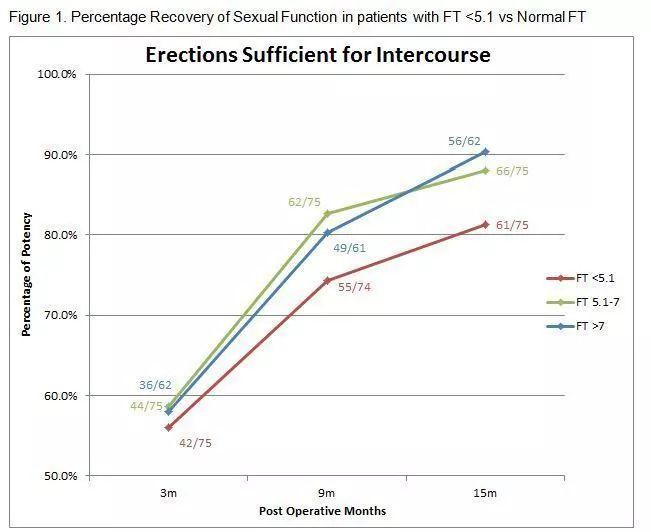 对于RARP术后的许多男性来说性功能障碍仍然是一个较为严重的问题。众所周知低睾酮(FT)是性功能障碍的一个的重要原因。2019 EAU报道的一项来自美国的研究(摘要:PT387)旨在评估术前低睾酮是否会减慢RARP术后男性的性功能恢复。研究对象包括RARP术前勃起功能国际指数( IIEF-5 )得分为22-25的男性。性功能恢复被定义为在RARP后3、9和15个月使用自我评估问卷对“勃起足够插入”和“勃起令人满意”的两个问题给与肯定答案。研究对术前低FT ( < 5.1 ng/dL)的男性与术前睾酮正常的男性术后性功能恢复情况进行比较。研究数据显示在442名男性患者中,75名( 17.0 % )术前FT< 5.1 ng/dL (低),75名( 17.0 % )术前FT介于5.1~7 ng/dL (中)之间,62名( 14.0 % )术前FT > 7 ng/dL (高)。在低FT组,56.0 % ( 42 / 75 )、74.3 % ( 55 / 74 )和81.3 % ( 61 / 75 )的患者分别在术后3个月、9个月和15个月性功能恢复。在中FT组,对应的比例分别为58.7 % ( 44 / 75 )、82.7 % ( 62 / 75 )。而在高FT组,则为58.1 % ( 36 / 62 )、80.3 % ( 49 / 61 )和90.3 % ( 56 / 62 )。在整个恢复过程中,与中高FT组相比,低FT的性功能恢复率较低。对于FT水平低于25个百分点的男性,15个月的性功能恢复率仅为81.2 % ( 39 / 48 ),而FT > 7ng/dL的男性则为90.3 % ( 56 / 62 )。研究结果表明较高的游离睾酮预测更快的性功能恢复,术前FT< 5.1 ng/dL可预测RARP术后3、9和15个月的性功能恢复缓慢,因此对于这部分病人术前应考虑进行睾酮替代治疗。