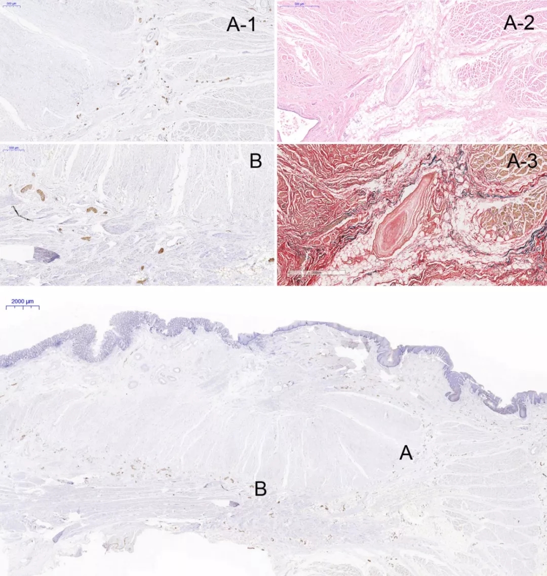 此外,对比粘膜层、粘膜下层、内括约肌、内外括约肌间隙、外扩约肌的神经纤维的密度以及直径,我们发现ISS内的神经纤维的直径以及密度都要高于其余解剖层次。同时,Victoria blue 染色显示内外括约肌间隙内有着大量的弹力纤维,并且与胶原纤维相互交织,分为7至9束通过外括约肌皮下部,并固定于肛缘。还需要注意的是,HE染色发现ISS内也存在Pacinian 小体,并且位置较深,而Pacinian小体对压力感受起着重要的作用。因此CSPO在避免括约肌间隙过多的分离之时,保护了括约肌间隙内的神经,弹力纤维和Pacinian压力感受小体,从而保护了术后的肛门功能。