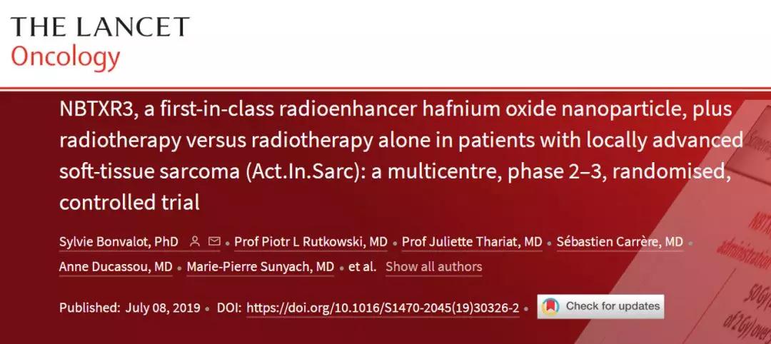 对于生长较快、体积较大而不易切除的软组织肉瘤,或分化差的复发性疾病,术前放疗有利于瘤体缩小,增加保留肢体、减少局部复发的机会。然而,只有少数软组织肉瘤患者接受术前放疗可获得病理完全缓解。巴黎居里研究所的肉瘤和复杂肿瘤外科部门负责人Sylvie Bonvalot博士在2018年ESMO大会上报告了放疗增强剂NBTXR3的阳性结果(Act.In.Sarc试验)而引起关注。2019年7月8日,《柳叶刀肿瘤学》在线刊登了这项2-3期临床试验,评估了氧化铪(HfO2)纳米颗粒NBTXR3作为局部晚期软组织肉瘤患者术前治疗的安全性和有效性。