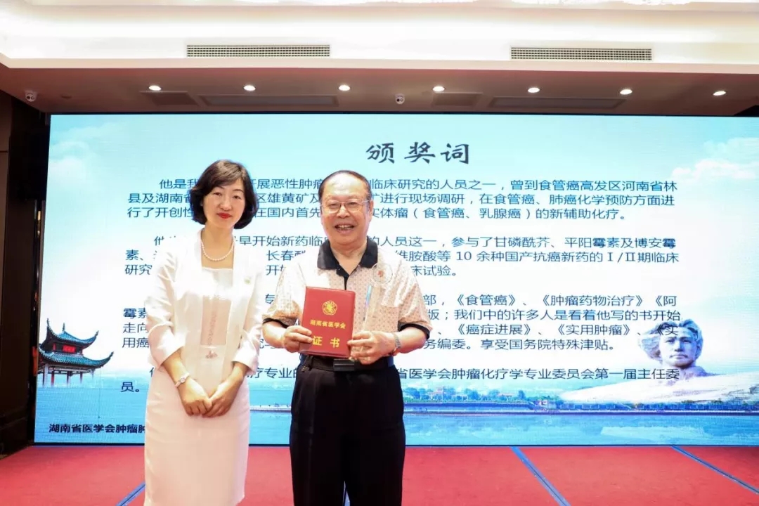 湖南省医学会肿瘤化疗学专业委员会走过了22年历程,考虑到学科传承和发展的目标,以及本省现状,在2018年8月更名为湖南省医学会肿瘤内科学专业委员会,为了表彰长期以来在肿瘤内科学领域做出卓越贡献并享有崇高威望的专家,经湖南省医学会的批准,在湖南省医学会肿瘤内科学专业委员会学术年会上特设立“终身成就奖”。湖南省医学会郭洁副秘书长致辞并颁发该荣誉奖项给湖南省肿瘤医院的王肇炎教授,这是对王肇炎教授过去为肿瘤事业作出的贡献的肯定!