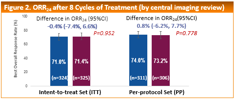 Prof. Xu: Sure. The use of HLX02 compared with EU-sourced trastuzumab results in an equivalent ORR at week 24. The primary outcome was ORR, which was 71.0% (HLX02) and 71.4% (EU-sourced trastuzumab) with no statistical difference observed (p=0.952) between the groups, and the ORR difference (-0.4; 95% CI: -7.4% to 6.6%) was also within the predefined margin (13.5% and -13.5%). With no new safety signals in comparison with EU-sourced trastuzumab, all secondary efficacy and safety analyses supported the biosimilarity of HLX02 and reference trastuzumab.