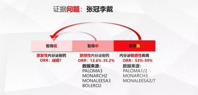 大会上与会后一些专家举了很多数据反驳我的观点,其实他们举的数据均来自于继发性耐药为主的研究数据。目前很难找到有力证据来支持内分泌治疗+靶向可以“逆转”原发性内分泌耐药。其实,这也是在大会上辩论时我努力想说明的第二个观点:内分泌治疗+靶向的高治疗反应率(与化疗媲美的ORR),现有证据几乎都来自于继发性耐药或内分泌敏感性疾病,所以不足以证明可以“逆转”原发性内分泌耐药。两者间是不能相互替换的,在大会上我打了一个比喻:我们不能从智商中等与智商高的人的考试成绩来推导智商低的人也能考出好成绩(图2)。