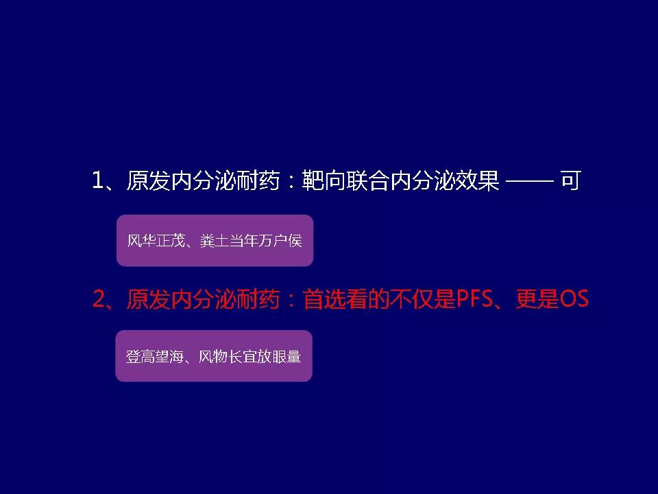 总体而言,我们应该意识到临床上确实有一类人是属于原发性耐药,尽管其为激素受体阳性患者,但她对内分泌治疗就是不敏感。就像我刚才比喻的她虽然具备女性性征但对男性并不感兴趣一样,但目前用时间cut-off值来定义虽有其局限性,但有一定的临床参考价值。其次,因为存在上述局限性,所以临床确实会存在误判。患者在两年之内出现复发我们判定为原发性耐药,两年毕竟是一个人为的定义,可能患者对内分泌治疗相对比较敏感,联合靶向治疗后是可以逆转的,所以我们还是要谨慎思辨。第三,临床上对原发性内分泌耐药患者要根据其复发转移出现的时间、转移的部位、肿瘤负荷、HR表达状态进行“辨证论治”,不宜一概化疗。这种“辨证论治”思维不仅是医学的艺术魅力所在,也是医生存在的价值所在。