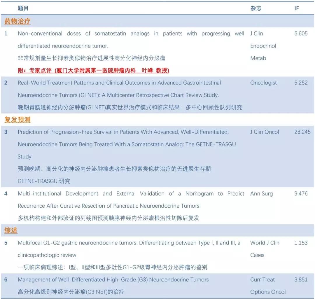 编者按:本篇文章为“诺华NET之声”2019年第八期,精选了2019年8月份以来神经内分泌肿瘤诊治领域最新发表的论文。其中,三篇论文与生长抑素类似物有关,包括研究非常规剂量生长抑素类似物治疗的有效性和安全性、构建生长抑素类似物治疗无进展生存预测模型以及探讨神经内分泌肿瘤患者治疗模式;一篇论文构建了胰腺神经内分泌肿瘤术后复发预测模型;尚有两篇论文分别综述了G3 NET的治疗和I、II和III型胃神经内分泌肿瘤的鉴别。本期特别邀请了厦门大学附属第一医院叶峰教授,对非常规剂量生长抑素类似物治疗高分化神经内分泌肿瘤有效性和安全性研究进行点评。