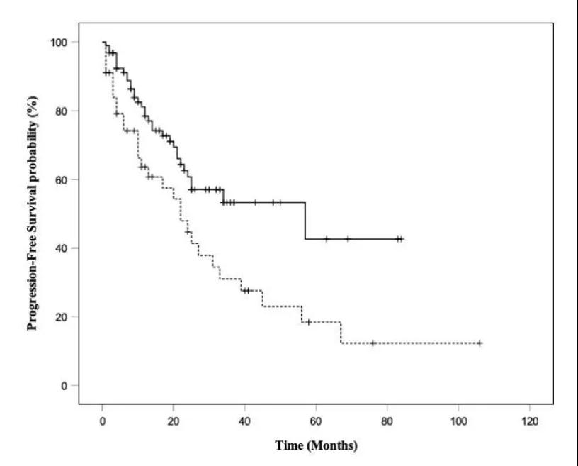 结果:198例患者中,140例符合纳入标准并纳入分析。总体上,中位PFS为31个月。与三线或更多线治疗相比,将HD-SSA作为二线治疗显著降低疾病进展或死亡风险(HR:2.12,P=0.004,图1)。增加HD-SSA治疗的剂量密度(N=133,95%)或强度(N=7,5%),对PFS无影响。根据RECIST标准,12例(8.6%)患者出现部分缓解,106例(75.7%)患者疾病稳定。21例(15.0%)患者出现不良反应,其中2例出现3级胆结石。无患者因不良事件而终止HD-SSA治疗。