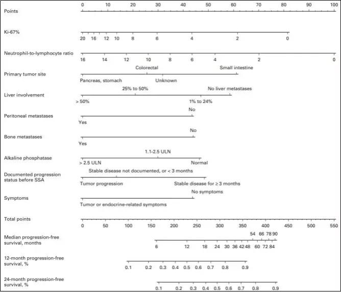 图3 GETNE-TRASGU(西班牙神经内分泌和内分泌肿瘤组-生长抑素类似物治疗胃肠道胰腺和未知的原发性神经内分泌肿瘤)的列线图。SSA,生长抑素类似物;ULN,正常值上限。