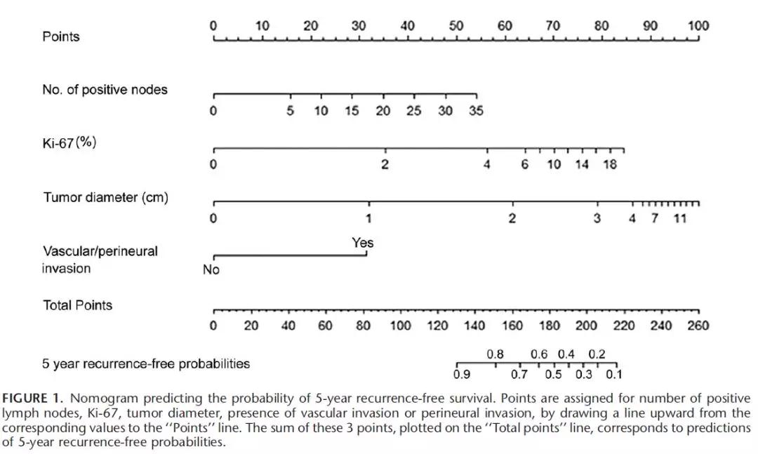 图4 预测局限期胰腺神经内分泌肿瘤术后5年无复发生存率的列线图