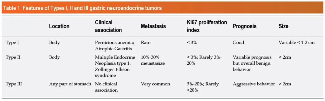表1 Ⅰ、Ⅱ和Ⅲ型胃神经内分泌肿瘤的特征
