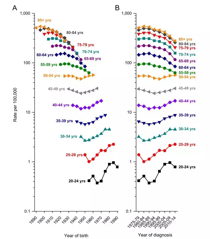 早发结直肠癌发病和死亡率呈上升趋势。据统计,<55岁结直肠癌患者的发病率逐渐成上升趋势,见图1。同时,20-29岁(统计年份1988-2014)死亡率变化为0.1%、30-39岁(统计年份1994~2014)死亡率变化为1.0%、40~49岁(统计年份2004~2014)死亡率变化为1.4%、50~55岁(统计年份2005~2014)死亡率变化为0.8%,<55岁结直肠癌患者的死亡率也呈上升趋势。