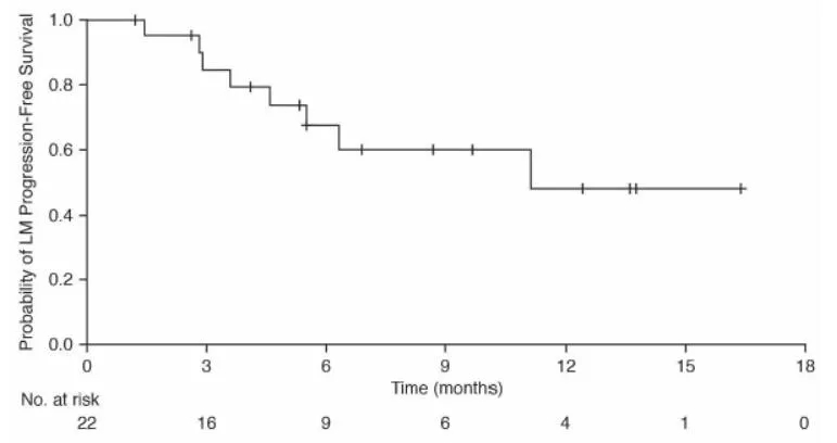 中位LM 反应持续时间未达到(95% CI: 2.8 个月–不能计算)。CNS ORR为23%(5 of 22; 95% CI: 8–45),系统ORR为46%(95% CI: 24–68)。中位LM PFS为11.1个月 (95% CI: 5–不能计算)(图2),9个月的LM无进展率为60%,中位CNS的PFS时间为6.3个月 (95% CI: 3.6–不能计算),系统PFS为4.4个月 (95% CI: 2.9–15.5个月)。